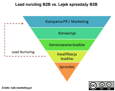 Gdyby przyjąć inny punkt widzenia i spojrzeć na lead nurturing z  punktu widzenia lejka sprzedaży B2B, wyglądałoby to jakoś tak: